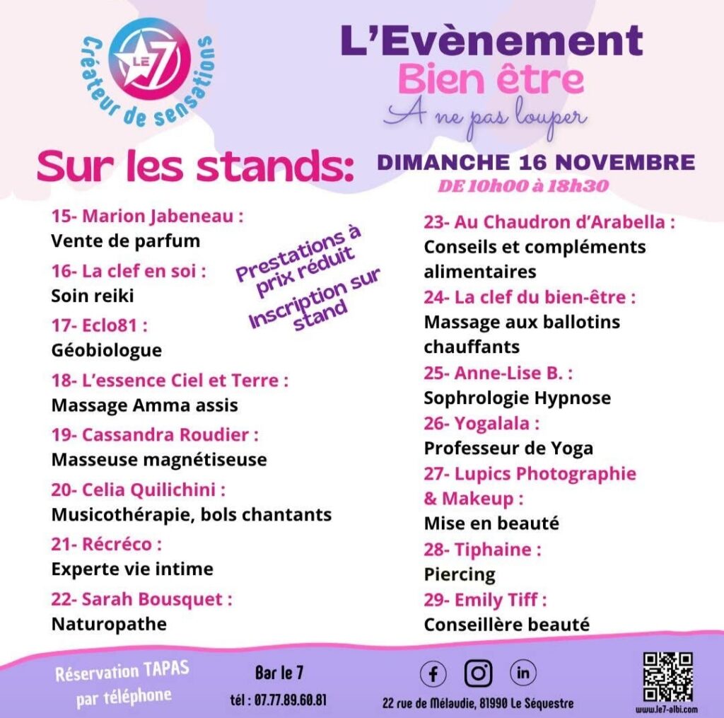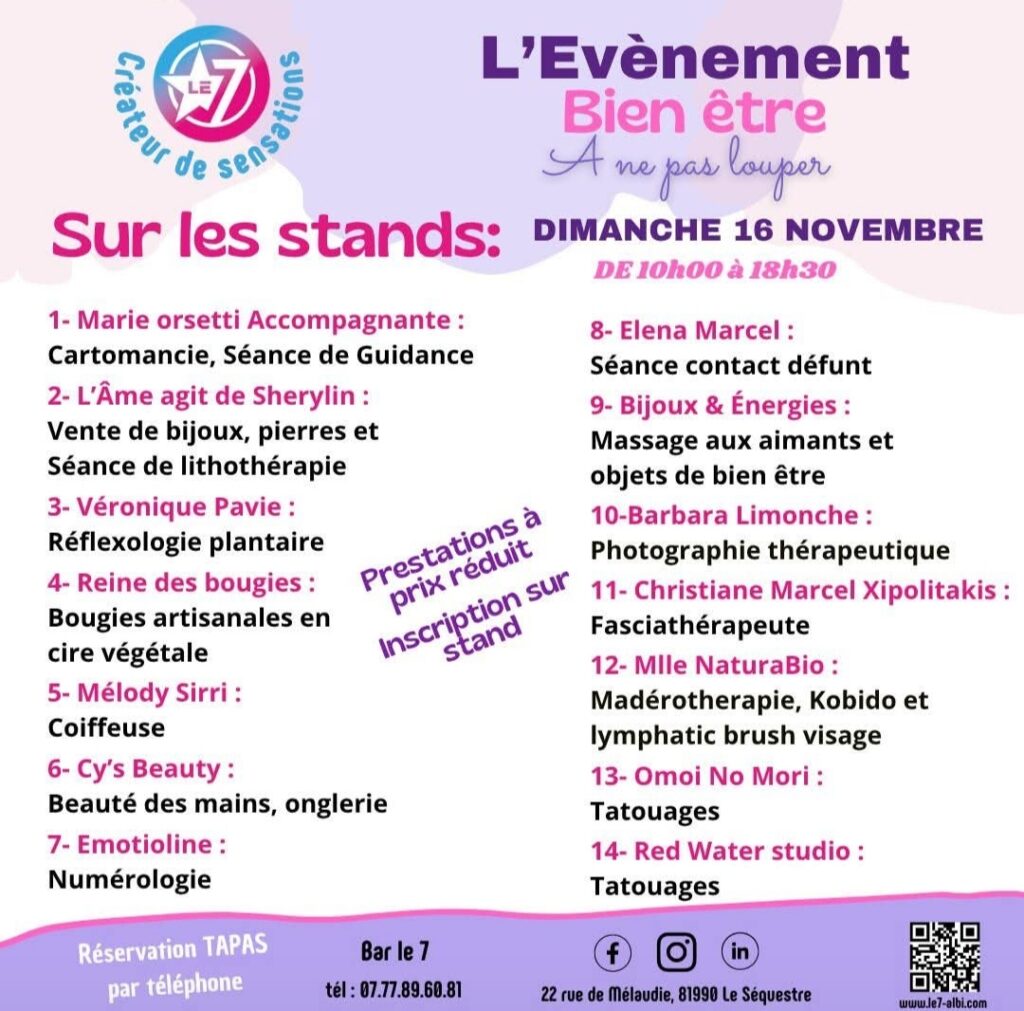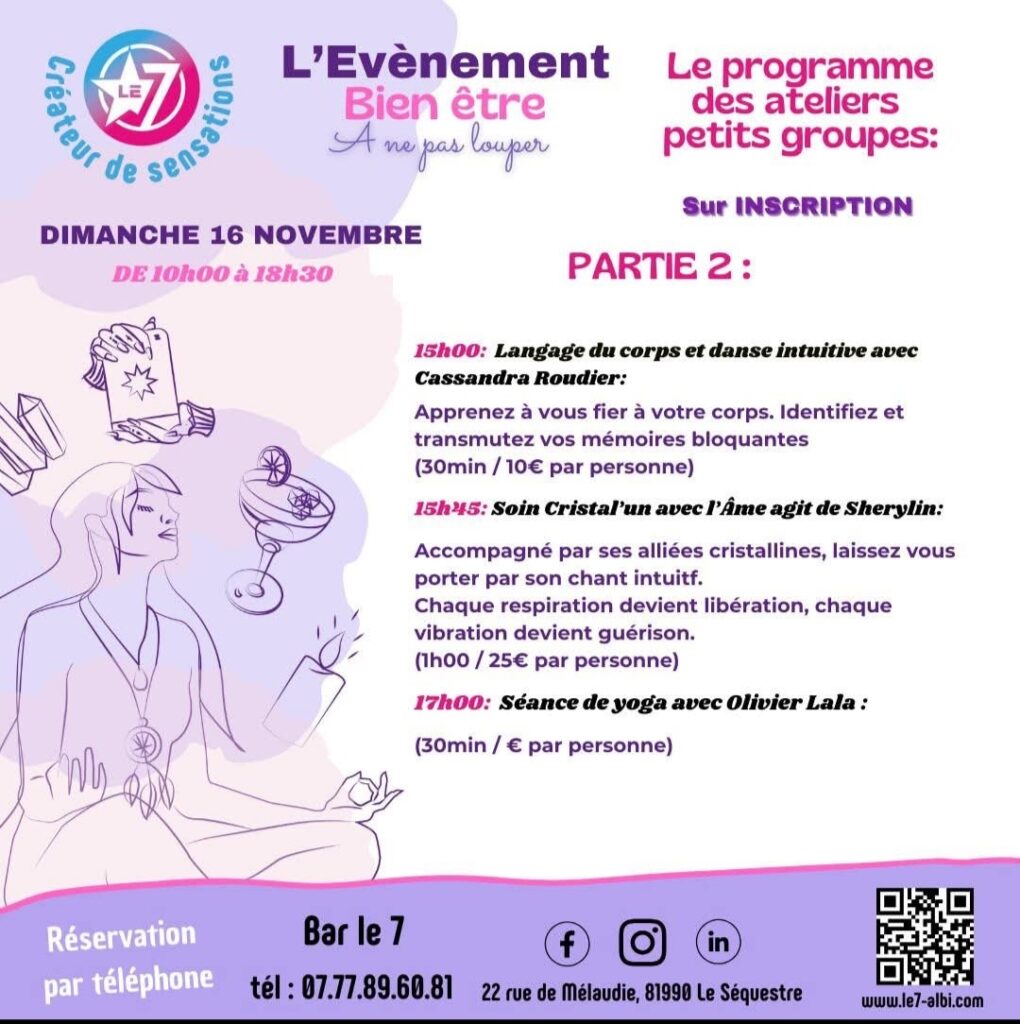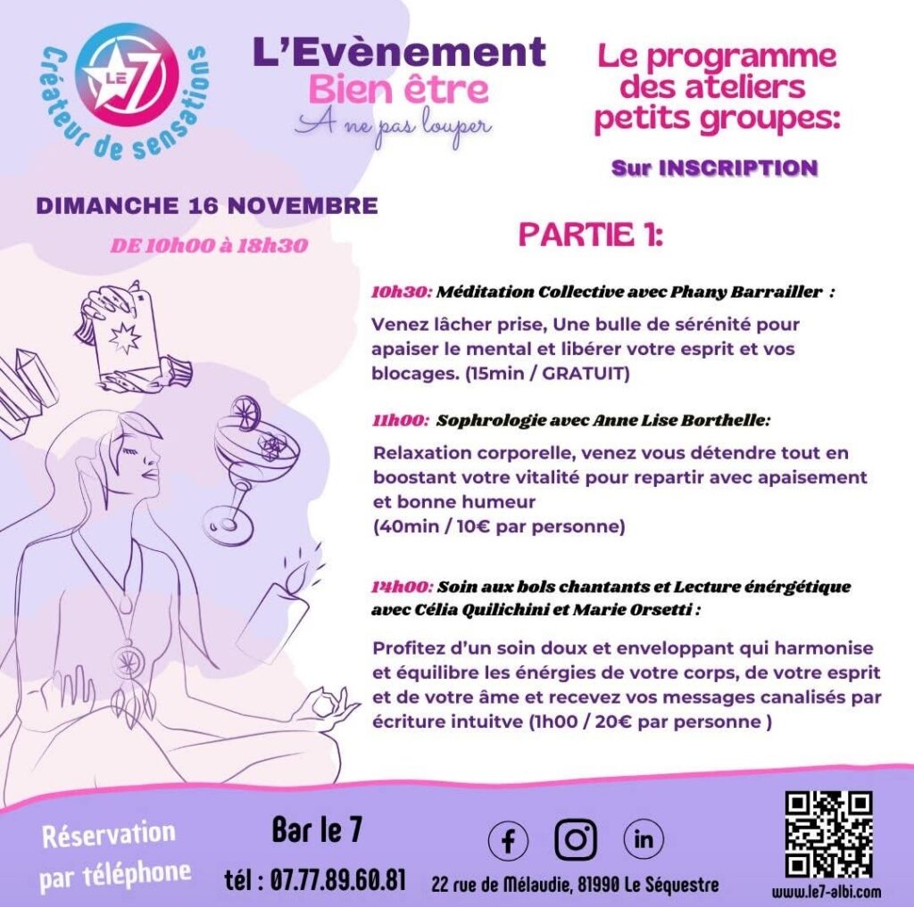 Le Dimanche 16 novembre 2025, « le7Albi » vous propose un évènement Bien-être, venez expérimenter les différentes approches proposées lors de cette journée, participer à des ateliers en petit groupe à tarif réduit, tenter votre chance gratuitement à la tombola. Entrée libre